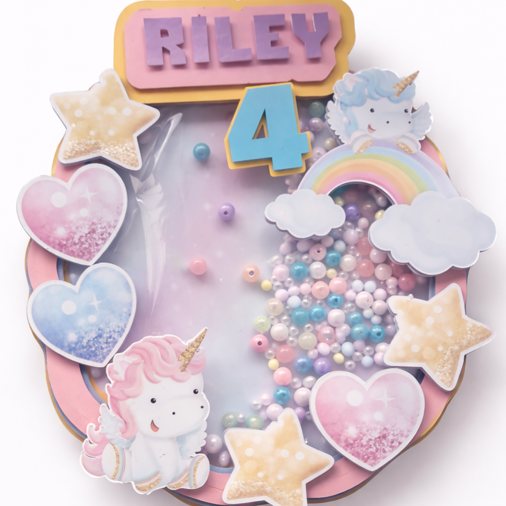 Add a sprinkle of magic to your special day with our Layered Personalised Unicorn Shaker Cake Topper! This dreamy topper features a stunning 3D layered design and a sparkling shaker element filled with glitter or sequins that shimmer beautifully with every move.